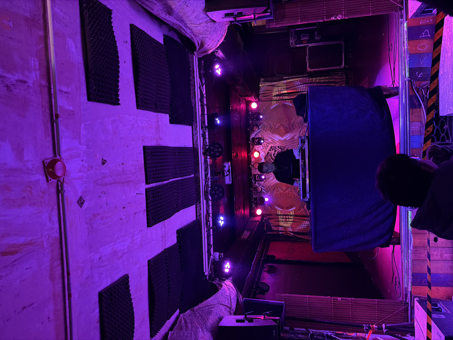 A DJ booth is lit with pink and purple lights in a club setting. Soundproofing panels are affixed to the wall beside the booth. A DJ faces the audience behind a partial curtain. An audience member is visible to the side of the booth. Cables and equipment clutter the floor. The scene has an industrial, underground atmosphere.