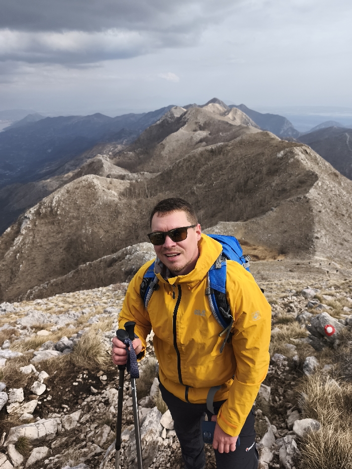 An adult male is depicted standing on a rocky mountain ridge in Mali Mikulići, Montenegro