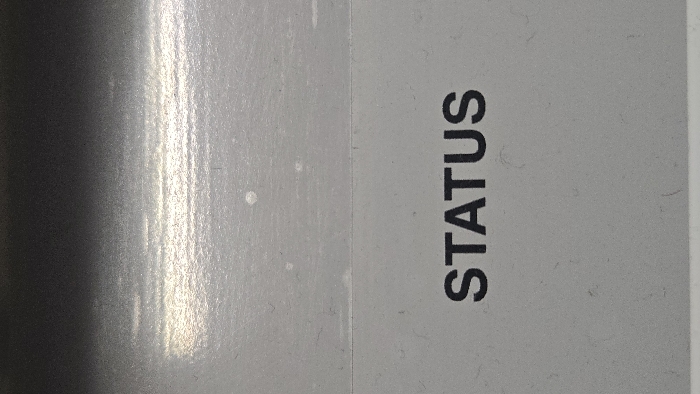 This is a close-up, vertically oriented photograph depicting a light gray, textured surface. The word "STATUS" is printed in uppercase black sans-serif font, horizontally centered in the lower half of the frame. A subtle, faint horizontal crease or line extends across the surface approximately one-third of the way down from the top edge, just above the text. The upper portion of the image shows a gradient, transitioning from a darker gray at the very top to a lighter gray band below it. This lighter upper band exhibits multiple horizontal streaks of bright reflection, indicative of an overhead light source interacting with a semi-glossy or uneven surface texture. Several small, irregular white spots and numerous dark fibrous specks, consistent with dust or lint, are visible across the entire light gray surface. No individuals are present. No actions or interactions are depicted. This scene is situated in Lompoc, United States.
