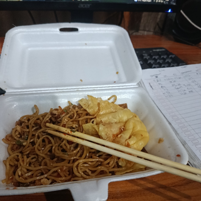 An indoor scene within an unspecified room in the city of Unknown, Unknown, displays a prepared meal on a wooden surface. A white styrofoam take-out container is open, revealing its lid in the upper left. The container's main compartment holds a quantity of dark brown, cooked noodles, mixed with small pieces of protein and green vegetable fragments. A pair of light-colored wooden chopsticks rests diagonally across the noodles. To the right of the noodles, several pieces of light yellow-wrapped fried wontons or dumplings are present. Adjacent to the right of the container, a white spiral-bound notebook with ruled pages is open, displaying handwritten numerical and textual entries in dark ink. A black object, possibly a calculator or keyboard section, is partially visible left of the notebook. In the background, an "Acer" branded computer monitor is visible, displaying dark-toned pixels, positioned in front of a dark, textured wall or partition. A black headset is partially visible in the far right background. No individuals are depicted.