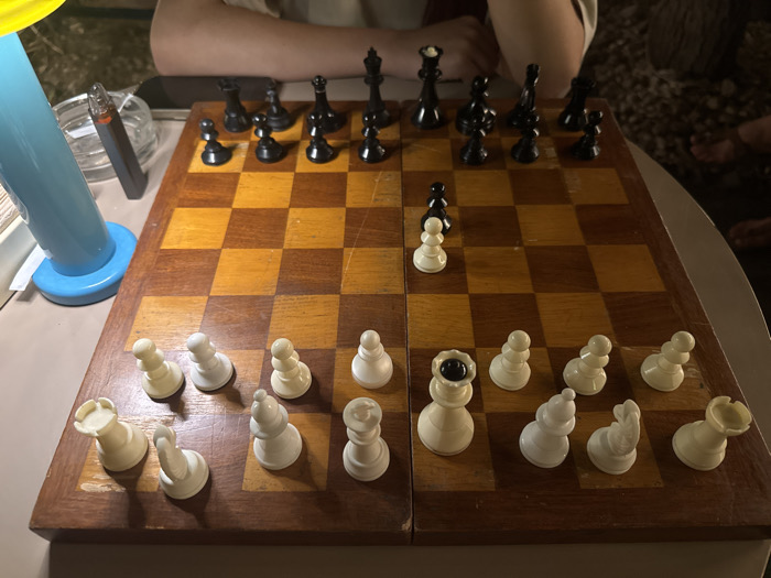 - "The image displays a wooden chessboard on a light-colored table, illuminated by a blue desk lamp at night" by FM-5N7nT2, licensed under CC BY 4.0