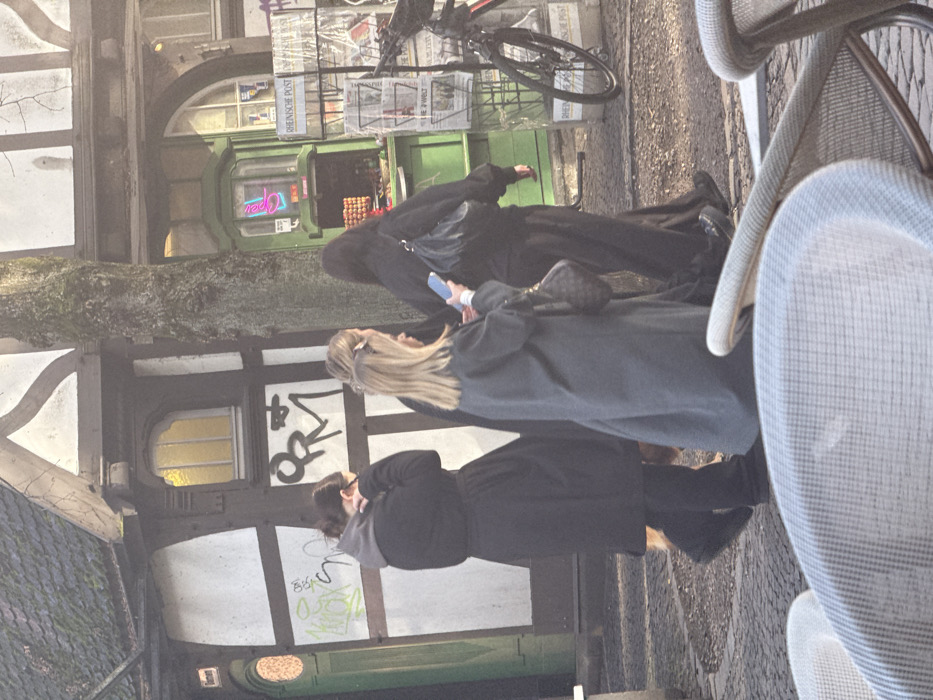 The scene depicts a street in Wuppertal, Germany. Three individuals, appearing to be women, are observed walking from left to right on a cobblestone surface. In the background, a traditional half-timbered building with white infill and dark wood beams is visible. The building features an arched window with a yellow light source inside and a green entrance door to the far left. Green graffiti tags are present on the white wall sections, notably a large "ORM" text. A mature tree trunk stands prominently between the building and a small green storefront. This storefront displays a pink neon "OPEN" sign and a tray containing numerous small, round, red-brown items. Adjacent to the storefront, a metal display stand holds stacks of newspapers, with "RHEINISCHE POST" and "DIE WELT" visible. A portion of a black bicycle's front wheel is visible near the newsstand. The leftmost individual wears a black long coat over a grey hooded sweatshirt and dark trousers. Her hair is dark and pulled back, and her right hand is positioned near her right ear. The central individual has shoulder-length blonde hair styled with two clips. She wears a dark grey long coat and carries a brown, patterned shoulder bag on her left side. She holds a light-blue smartphone with both hands, looking down at the screen. The rightmost individual has dark hair and is dressed in a black long-sleeved top and black wide-leg trousers. She carries a black shoulder bag on her right shoulder and is oriented with her back largely facing the viewer. In the immediate foreground, out of focus, portions of two light-colored, wicker-style outdoor cafe chairs are visible. The scene is illuminated by natural sunlight, casting shadows towards the right, indicating daytime.