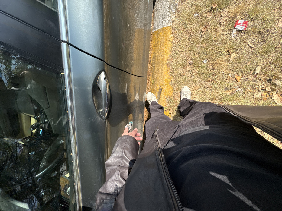 A person stands next to a gray car, hand near the door handle. The person wears corduroy pants, white sneakers, and a black leather jacket. The car is parked close to a yellow curb with grass and debris visible on the other side. The car's window shows a reflection of the interior and outside environment.