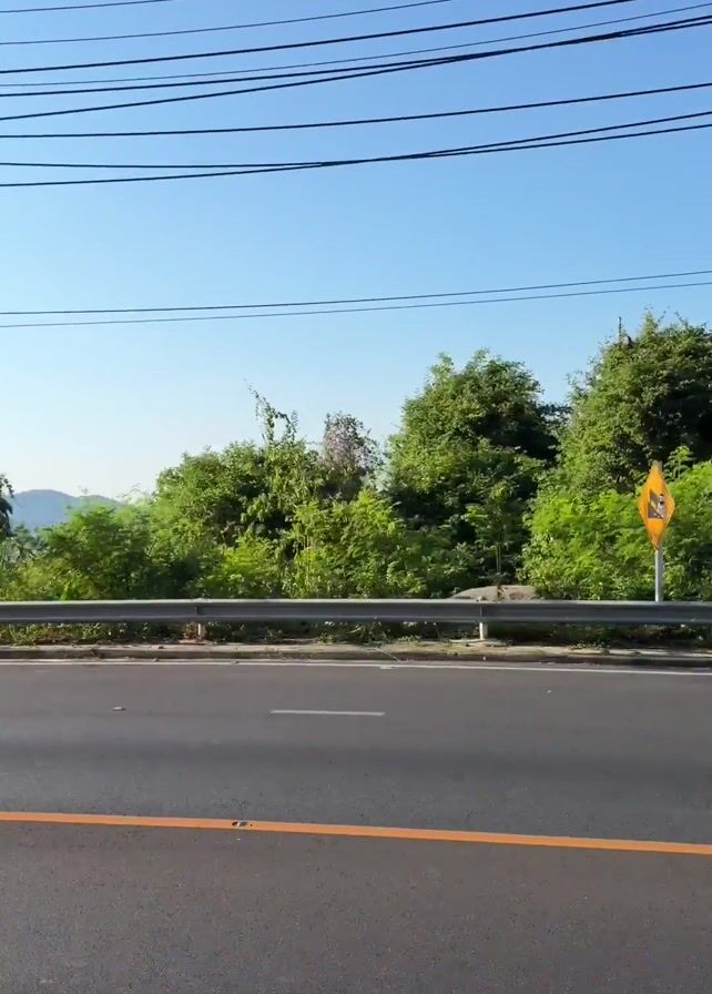 The camera moves along a highway, past an open view. Trees and bushes are on the other side of a metal guard rail, leading down to a blue ocean view. Mountains and buildings are in the background. There is a light pole and electrical wires in the foreground. The road has a yellow line on the edge, and white lines. The sky is clear and blue.