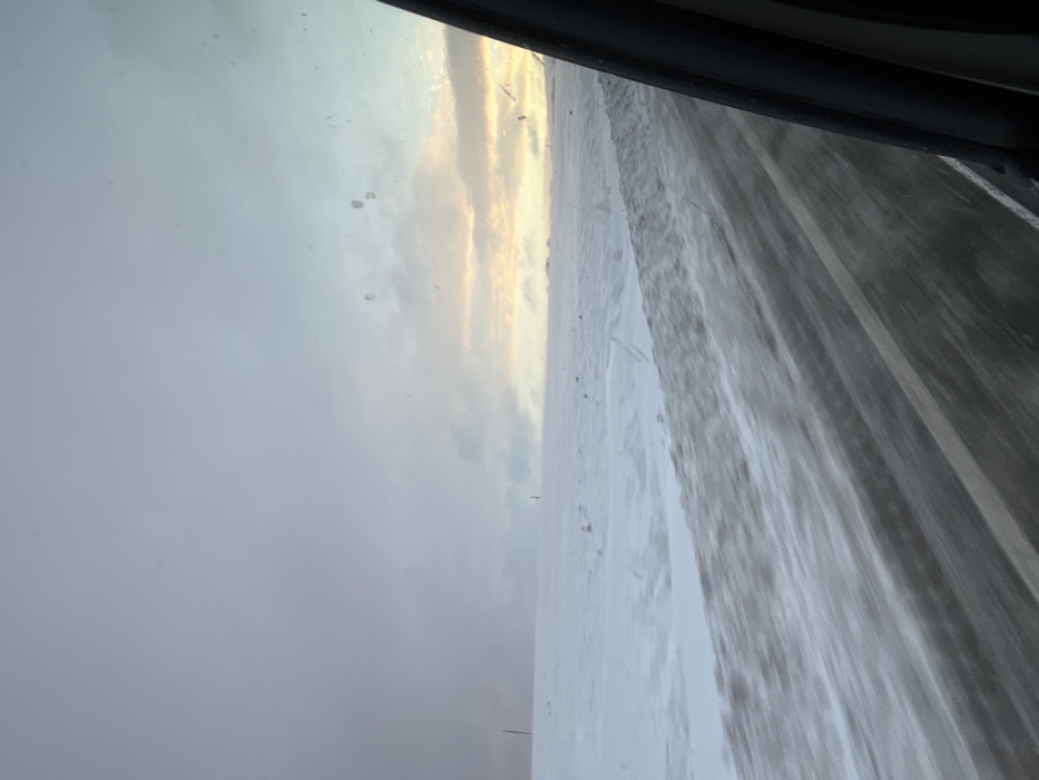 The image depicts a winter landscape observed from inside a moving vehicle in Fadeevo, Russia. A two-lane asphalt road, partially covered in slush and packed snow, occupies the lower portion of the frame, exhibiting motion blur consistent with vehicular movement. A white lane marking is visible on the asphalt. To the left of the road, a vast, snow-covered field extends to the distant horizon. Indistinct dark vertical structures, resembling utility poles, are sparsely visible within the snowy expanse. The sky is largely overcast, transitioning from a dark grey-purple on the left to a lighter, yellow-orange hue on the right horizon, suggesting dawn or dusk light breaking through clouds. The vehicle's side window, framing the scene on the right, shows multiple small water droplets or smudges, particularly in the upper right quadrant. No individuals or direct interactions are visible.
