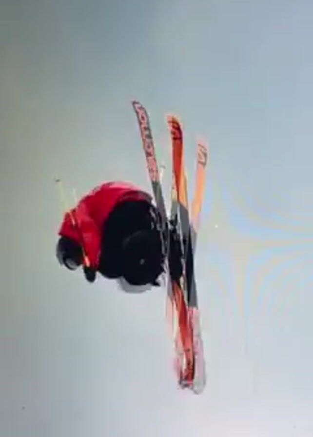 skier performing tricks and navigating through a snowy, wooded environment. The first clip features a skier in mid-air, doing a flip with their skis visible. They are wearing a red jacket and black pants. The skis are branded with "Salomon." The next clip shows the skier in the same attire landing. The final clip shows a skier, wearing a different patterned jacket, skiing through a snow-covered forest. The trees are bare and laden with snow. The background is a cloudy, overcast sky.