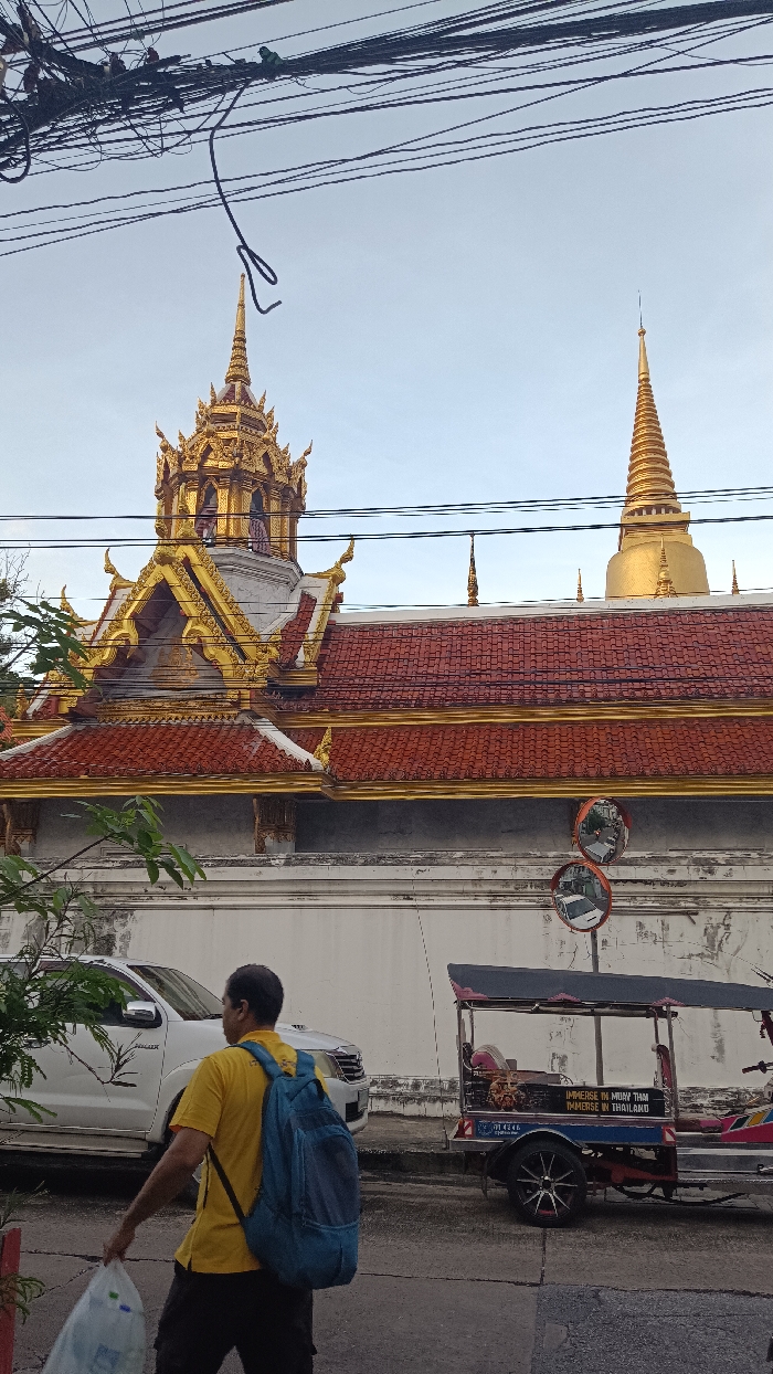 An outdoor, eye-level photograph depicts a street scene adjacent to Wat Bowonniwet Vihara in the Phra Nakhon District of Bangkok, Thailand. The upper portion of the image shows a pale, overcast sky crisscrossed by numerous black overhead electrical wires, one of which hangs low with a distinct loop. In the background, the ornate golden multi-tiered roof and spire of a Thai Buddhist temple structure are visible, alongside a taller, golden, conical chedi/stupa with a pointed finial. The temple features red-tiled roofs with prominent golden trim and white architectural elements. A weathered, off-white wall with horizontal molding extends across the middle ground, separating the temple grounds from the street. Mounted on this wall are two circular convex traffic mirrors. On the street, a white Toyota pickup truck is partially parked on the left, displaying a black decal. To the right, a blue and pink motorized tuk-tuk with a dark canopy and black wheels is also parked, featuring text on its side. In the foreground, a male individual walks from left to right, wearing a yellow short-sleeved shirt, dark pants, and a blue backpack. He carries a transparent plastic bag containing a white item in his left hand. Green foliage from a plant or bush is visible in the lower-left corner, and the ground consists of cracked asphalt or concrete.