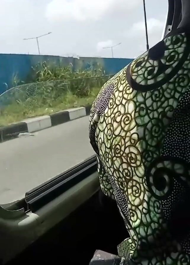 A person is sitting in the passenger seat of a vehicle, seen from the rear three-quarter angle. The person is wearing a patterned green, black, and white shirt. The vehicle is moving along a road with a blue fence on the right. Barbed wire is visible above the fence. The camera is inside the vehicle, focused on the person and the passing scenery. The video was recorded using a Tecno Spark 9T phone.