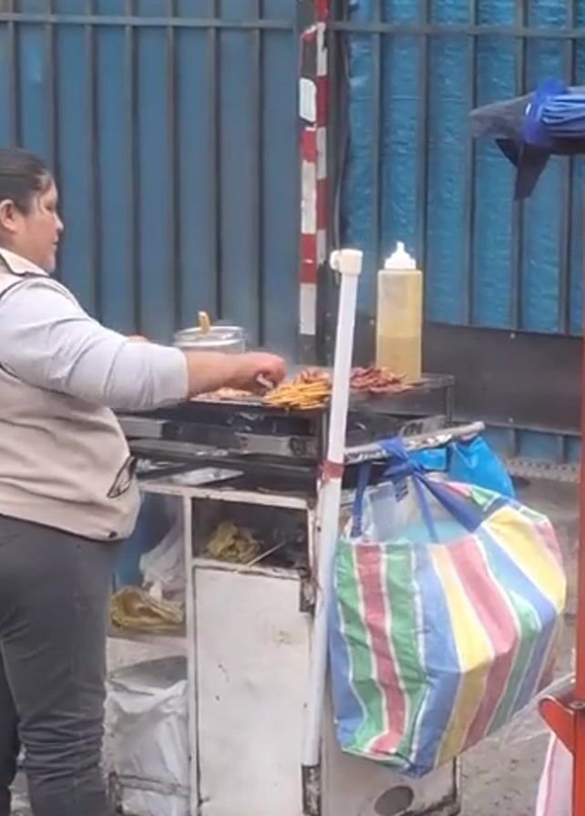 woman cooking meat skewers on a mobile cart on a city street. The woman is middle-aged, with dark hair pulled back in a ponytail. She is wearing a light-colored long-sleeved shirt and a tan vest, with dark pants. She stands behind a small cart that has a metal grill on top where she is cooking the meat skewers. To her right, on the cart, there's a metal pot with a lid, a plastic bottle with a yellow liquid, and a striped bag hanging from a pole. There is a red oven to the right of the cart. Several people pass by the cart. The background is a blue metal wall.