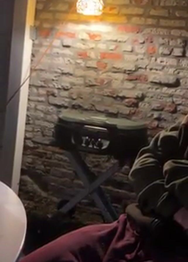 The camera focuses on a grill placed near a brick wall, under a lit outdoor lamp