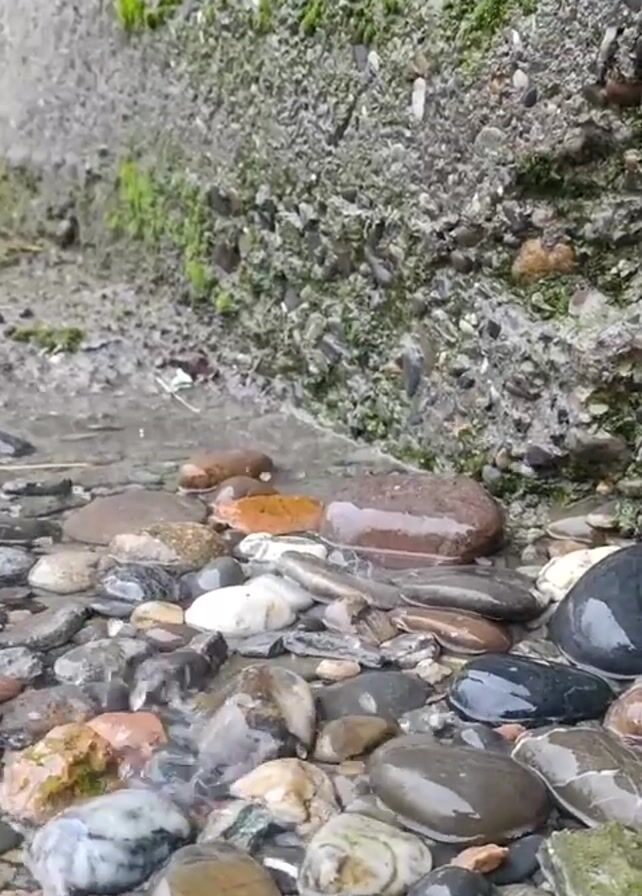 The camera is very close to the ground, positioned near a trickle of water flowing over small, smooth rocks