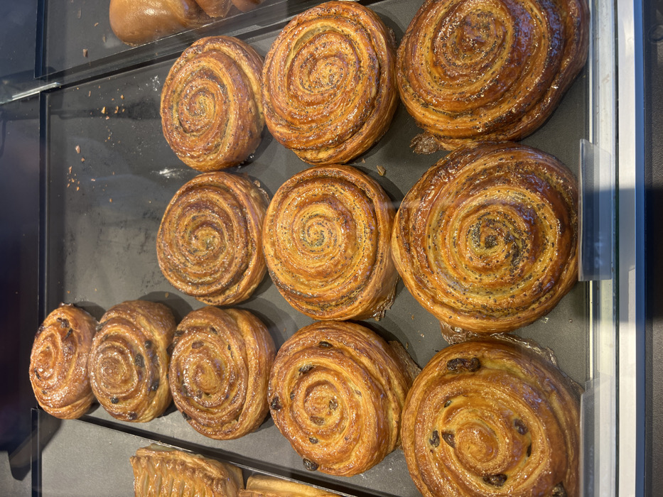 The image displays a static scene inside a retail display case in Vsevolozhsk, Russia. Multiple golden-brown, glossy-glazed, spiral-shaped pastries are arranged in rows on black trays. Approximately eleven of these pastries are fully or partially visible. Some of the spiral pastries contain dark raisins, while others are topped with small black poppy seeds. A partially visible, rectangular, layered pastry is present on the far left edge of the frame, and a portion of a rounded, golden-brown pastry object is visible on the far right. The pastries are observed through a clear glass barrier.