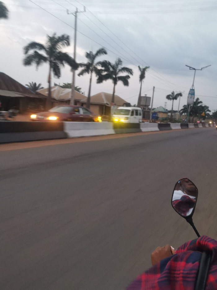 A street scene at dusk, showing a road divided by a barrier with a red car and a white van driving on the opposite side. Palm trees and buildings line the street. A rearview mirror of a motorcycle is visible in the foreground, reflecting a person wearing a plaid shirt. The sky is overcast, and the light is dim. The scene conveys a sense of movement, likely from the moving motorcycle.