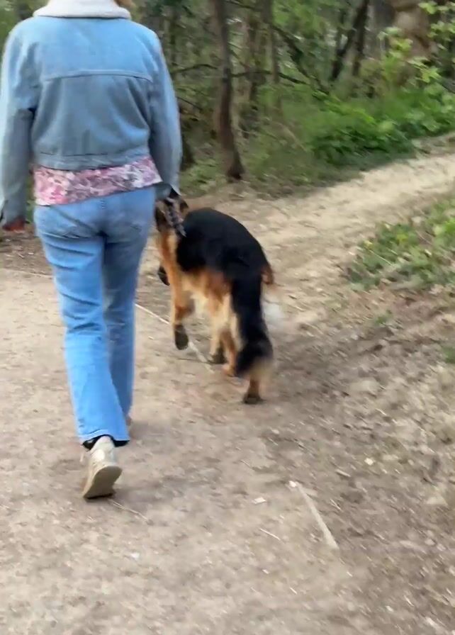 - "A woman wearing a denim jacket, blue jeans and tan shoes walks down a dirt path, with a German shepherd dog walking to her right on a leash" by FM-Kz4ET2, licensed under CC BY 4.0
