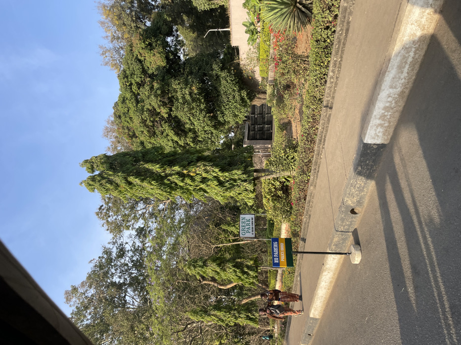 A verdant scene features a dense array of trees and foliage against a clear sky. A prominent, tall, columnar tree stands amidst other trees and shrubs. Signage for "Green Park" is visible. A "No Parking" sign is placed near the roadside. A section of road borders the greenery, with shadows cast upon its surface. The scene appears to be captured at an angle.