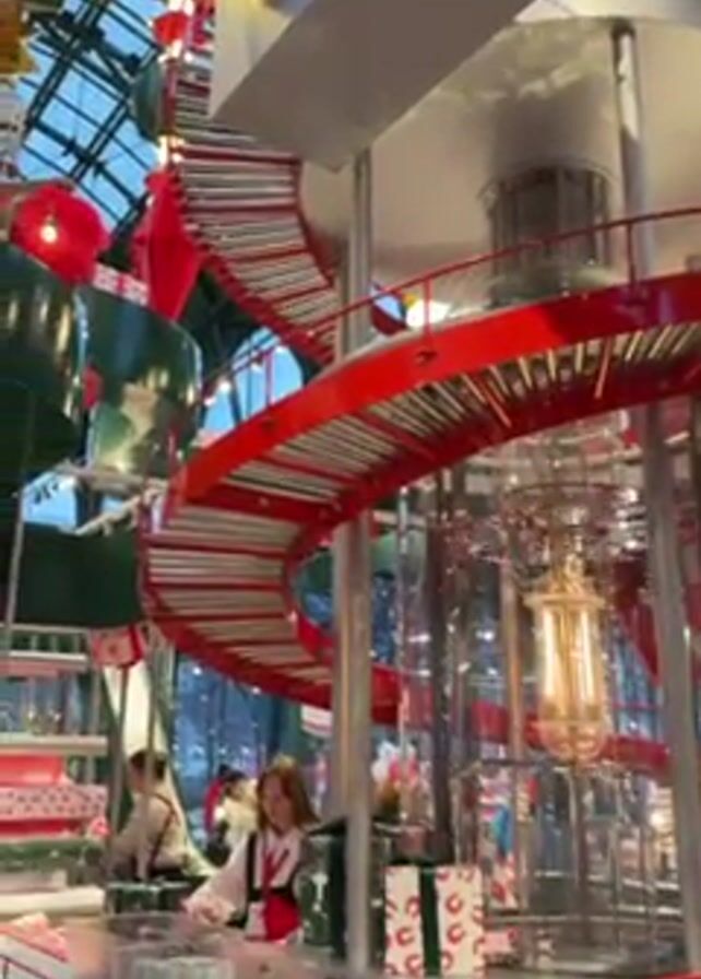 complex, automated gift-wrapping station likely located inside a building. A winding, red and white conveyor belt system carries wrapped gifts. In the center of the shot is a cylindrical, glass-encased structure with a light inside. Several people, likely employees, are positioned along the conveyor belt, possibly inspecting or managing the gifts. The ceiling is high and mostly glass, allowing natural light to filter in. The decorations are in a festive, Christmas-themed style with red and green colors dominating the scene. Large, circular green and red decorations hang from the ceiling. The overall impression is of a busy, organized, and festive gift-wrapping operation.