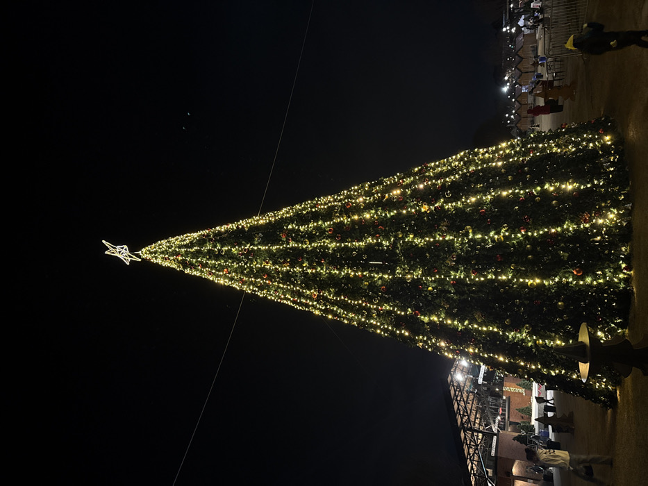 A brightly lit Christmas tree dominates the dark night, adorned with strings of lights and red ornaments. A radiant star tops the tree. Below, a structure appears to be a building or stage, with people milling around. The ground is visible, suggesting an outdoor setting. A few overhead lights illuminate the background, adding a soft glow to the scene.