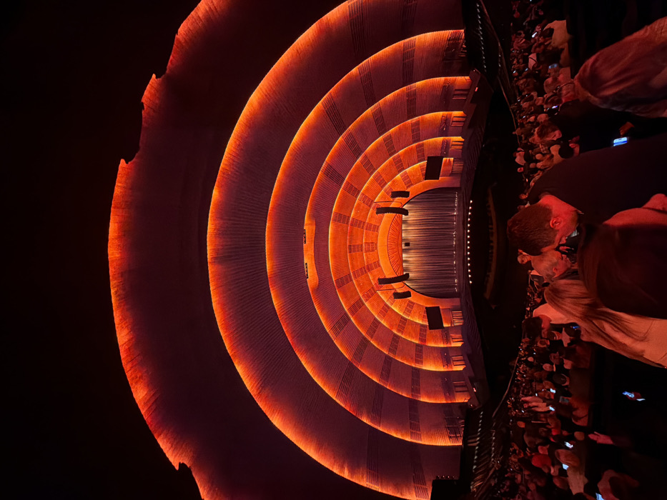 A view of a theater's interior, lit in orange hues. Concentric circles stretch across the ceiling, their edges glowing. Below, a dense crowd of people fills the seating area. Many are holding up phones, presumably taking pictures or videos. A few individuals are distinctly visible, their faces illuminated by the phones' screens. The overall scene captures the ambiance of a live performance viewed from an elevated position.