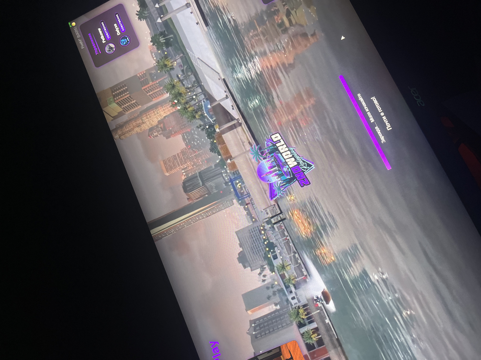 screen displaying the game "2nd World Roleplay" on an Acer laptop. The loading screen indicates the game is almost ready. A menu in the top left corner shows the username "Petkoww" and "Delyxe" marked as "СОБСТВЕНИК" (Owner). The game's graphics depict a cityscape, resembling Miami, reflecting in the water. The frame rate is displayed as 67 FPS.