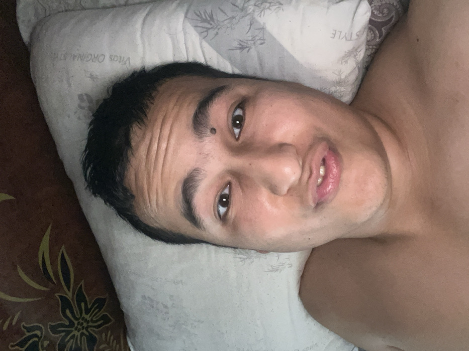 A man lies on a patterned pillow, looking at the camera. He has short, dark hair, a mole above his left eyebrow, and brown eyes. His skin appears light brown, and his lips are slightly parted. He is shirtless. The background includes a dark, floral-patterned surface. The pillow case has gray and white foliage pattern.