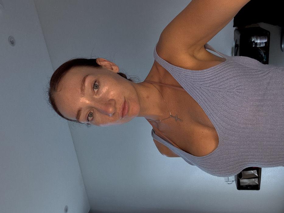 The image depicts a female subject in a medium close-up, positioned indoors within the city of Munggu, Indonesia. The woman has fair skin, numerous freckles across her face, and reddish-brown hair styled away from her face. Her light-colored eyes are directed towards the camera, and her expression is neutral. A noticeable sheen is present on her facial skin. She is attired in a light blue, ribbed V-neck tank top, under which a peach-colored strap is visible on her left shoulder. A silver-toned chain necklace with a cross pendant rests on her chest. The background features a plain light-colored wall. To the subject's left, a dark wall-mounted shelf is partially visible, displaying a clear glass and other indistinct items. To her right, a dark surface supports multiple small white bottles or containers. A recessed ceiling light fixture is visible in the upper left corner of the frame.