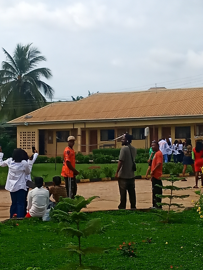 This image depicts an outdoor scene in the city of Onitsha, Nigeria, featuring a group of individuals on a paved area adjacent to a building. In the foreground, a vibrant green lawn covers the lower portion of the image, dotted with several small evergreen-like plants and a few clusters of red-flowering plants. Two individuals are seated on the ground within this area; one wears a light-colored top and dark pants with red accents, while the other is dressed in a patterned brown top and dark pants. The midground features a light-colored paved surface, possibly a pathway or courtyard, where several people are standing. On the left, a person wearing a white long-sleeved shirt and dark blue pants is seen from behind, holding a black smartphone vertically, as if recording or photographing. Another individual in a similar white shirt is partially visible directly behind them. To their right, a male in an orange jersey with the number "18" on the back, dark track pants, and a light-colored baseball cap stands, looking towards the viewer. Further right, a male in a dark grey t-shirt, dark pants, and headphones stands with a dark strap across his chest, looking to the right. Next to him, another male in an orange shirt and dark pants also faces right. A white upright pole stands on the paved area in front of the building. The background is dominated by a single-story building with light-yellow walls and a prominent brown/orange tiled hip roof. The building has multiple rectangular windows and doorways. On its left side, a section of the wall features a patterned ventilation block design, and a light fixture is mounted above it. In front of the building, a well-maintained garden bed with various green shrubs separates it from the paved area. A group of approximately 5-7 individuals, many wearing white shirts, are gathered near the building on the right side of the paved area. One person on the far right is distinguishable in a red dress. A tall palm tree is visible on the far left, extending above the building's roofline. The sky above is overcast with light cloud cover.