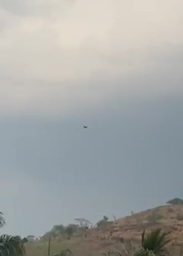 bird flying against a cloudy sky, above a landscape with a hill and trees in the foreground. The camera zooms in on the bird as it flies.