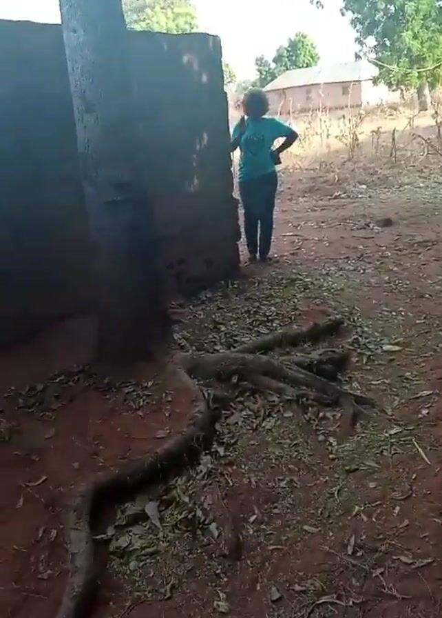 A woman stands with her left hand on her hip, leaning against a dilapidated brick structure. A large tree with exposed roots stands beside the structure. The ground is covered in dry leaves and dirt. In the background, there is a field with some trees and a building in the distance. The woman is wearing a green t-shirt and dark pants.