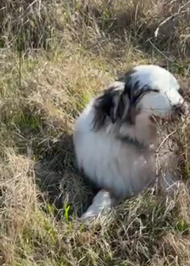 dog sitting in a patch of dry grass and low branches. The dog has a predominantly white coat with patches of grey and black, and is wearing a teal collar. The dog seems to be looking to its left, and moves its head slightly. A voice can be heard speaking in Russian throughout the video.