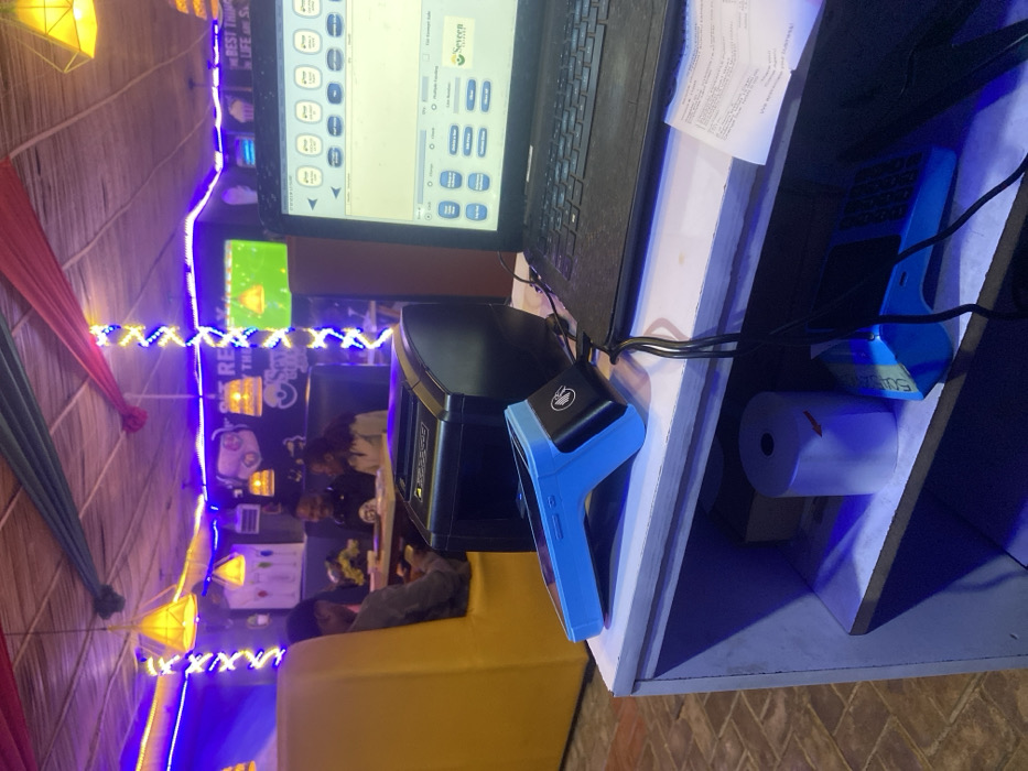 A point-of-sale setup features a laptop displaying a screen with various buttons, a blue credit card reader, a printer, and a roll of receipt paper. The equipment sits on a white shelf against a blurred backdrop of a lively interior space. Decorations include string lights and colorful fabric strips. People are seated in the background, creating a sense of activity.