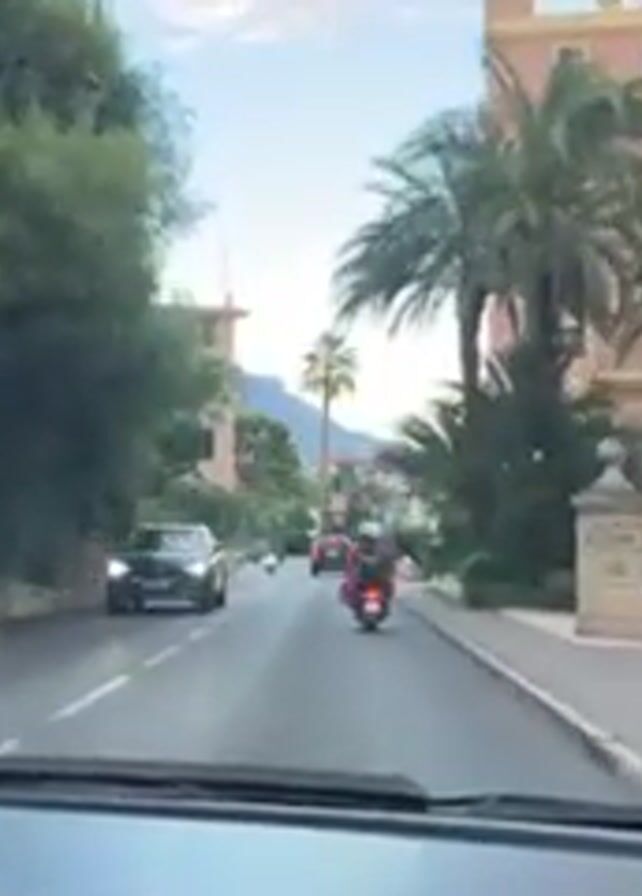 From the inside of a moving vehicle, a driver's perspective is revealed on a street flanked by trees and stone walls on the left, and a large building with palm trees on the right