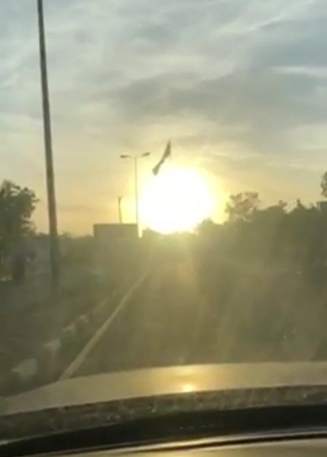 view from inside a car driving towards the sun. The sun is low in the sky, causing a bright glare. There is a flag blowing in the wind in front of the sun. A streetlight is visible next to the flag. There are some buildings and trees in the background. The windshield of the car appears dirty. The sky is partially cloudy.
