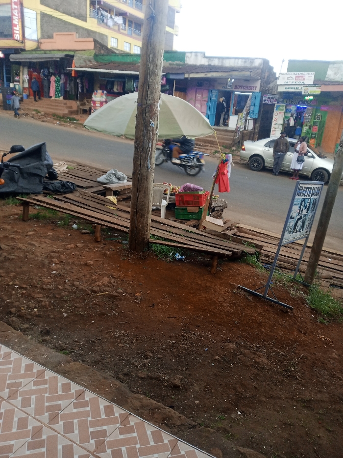 A street scene features a roadside fruit stand shaded by an umbrella, next to wooden planks and a sign advertising a salon. A motorcycle passes in the street, where a silver car is parked with two people standing nearby. Shops line the street in the background under a cloudy sky. The foreground shows bare earth transitioning to a tiled walkway.