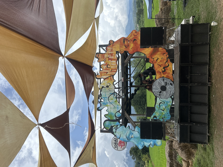 An outdoor event scene is depicted in Ban Mae Ping, Thailand, under a partly cloudy sky. Overhead, a large, multi-panel canopy of triangular and trapezoidal fabric sections, alternating between beige/tan and dark brown, is suspended by ropes. In the midground, a two-tiered rustic stage structure, constructed from wooden beams, is visible. It is adorned with large, stylized cutout artworks: a blue-toned profile of a human face (facing right) on the left, and an orange/yellow-toned profile of a human face (facing left) on the right. Both faces feature abstract organic shapes extending from them, creating a symmetrical design. A circular white sign with red text and a red building logo reading "10RAI FOOD AND DRINKS" is affixed to the upper left of the stage structure. On the central platform of the stage, three individuals are present. One individual with long dark hair is on the left, looking towards the center. A second individual, centrally positioned, is interacting with a black DJ console, upon which a circular white object with intricate black patterns rests. A third individual is partially visible behind the central figure on the right. Sound equipment is arranged around the stage. A row of at least eight large, black speaker cabinets forms the base of the stage at ground level. Two smaller black speaker units are stacked on a raised stand to the left of the DJ setup, adjacent to the blue face art. Another two similar smaller black speaker units are stacked on a raised stand to the right of the DJ setup, adjacent to the orange face art. The foreground consists of bare ground or sparse grass. Several hay bales are stacked to the left of the stage. In the background, expansive green rice paddies stretch towards a distant mountain range under the cloudy sky. A blue canopy/tent is partially visible on the right side of the background. A white plastic cup is on the ground to the far right.