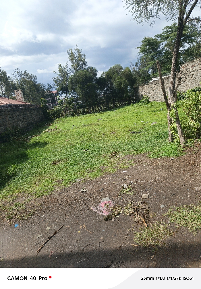 The image depicts an undeveloped land parcel in Nakuru East ward, Kenya, under an overcast sky. The foreground features a dark brown dirt path interspersed with small patches of green grass. Scattered debris on this path includes small branches, dry leaves, a crumpled piece of reddish fabric or plastic, and a small blue item. Shadows are cast across the lower right portion of the path. Immediately beyond the dirt path lies a large expanse of unkempt green grass, showing varying degrees of growth and some bare soil patches. On the left side of the scene, a low, weathered masonry wall constructed from dark grey stone blocks runs horizontally. Above and behind this wall, a structure with a reddish-brown tiled roof and a prominent white chimney is partially visible, suggesting a residential building. Further in the background on the left, a cluster of green trees and the upper floors of a multi-story building can be discerned. On the right side, a taller masonry wall, similar in construction to the left one, forms another boundary. Directly in front of this wall, on the edge of the grassy area, stands a prominent, vertical, multi-stemmed dead tree trunk, appearing to be stripped of bark in sections. Behind the right wall, a dense line of numerous green deciduous trees forms a backdrop, some appearing to be part of a larger wooded area. The sky above is largely covered with white and grey clouds, indicating a cloudy or partly cloudy day. No individuals, animals, or discernible actions are present in the frame.