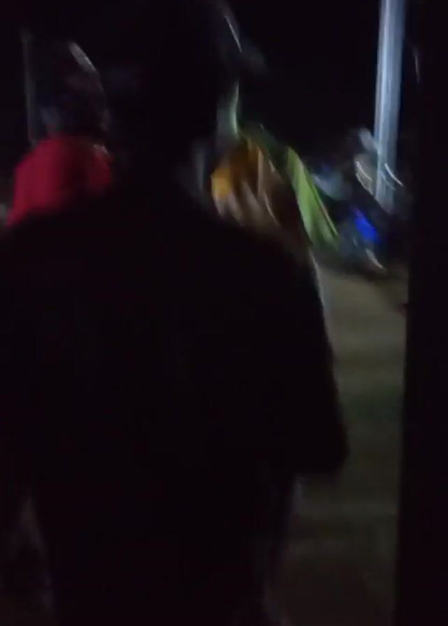 At night, a person wearing a red shirt and a baseball cap is standing outside among a crowd of people. The person is facing the camera briefly, and then turns away. The background is dark, but there are street lights and other people visible. The environment is likely a public gathering or event.