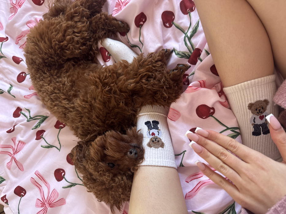 The image depicts an indoor scene in L'hospitalet De Llobregat, Spain, focusing on a close-up view of a person's lower body and a small dog. The subjects are positioned on a surface covered by a light pink fabric patterned with red cherries and pink ribbons. A reddish-brown, curly-haired dog, resembling a poodle, lies relaxed on its side with its head resting on the human's left lower leg. The dog's eyes are partially visible. The human subject's legs are partially exposed and bent, both wearing white, ribbed ankle socks. The left sock displays an embroidered light brown teddy bear holding a chocolate chip cookie. The right sock features a grey teddy bear wearing a black suit, white shirt, and red tie, holding a white heart, facing towards the bear on the left sock. A human hand, with manicured nails featuring white French tips, is visible in the lower-left foreground. A pink garment or blanket is also visible beneath the hand. The scene conveys a static, relaxed interaction between the animal and human.