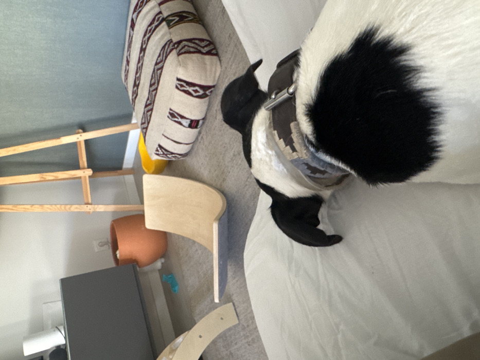 The image depicts an indoor domestic scene in Lisbon, Portugal. In the foreground, a black and white dog is lying on a white surface, observed from a rear perspective. The dog has black fur on its head and ears, and white fur on its body, and wears a brown collar featuring a light-colored geometric pattern secured by a metal buckle. In the background, on a light-colored floor, several objects are visible. A light-wood balance board with a dark gray top surface is positioned centrally. To its right, a square floor cushion or pouf with a beige base and red and brown geometric striped patterns rests on the floor. A terracotta-colored plant pot with an irregular opening sits against a light gray wall section, near which a small blue object is also on the floor. A wooden artist's easel stands against a textured, light blue wall to the right. To the far left, a dark gray rectangular object, possibly a monitor or television, is on a surface next to a white cylindrical item. A yellow bowl is partially visible behind the patterned cushion. A power outlet is visible on the wall behind the plant pot.