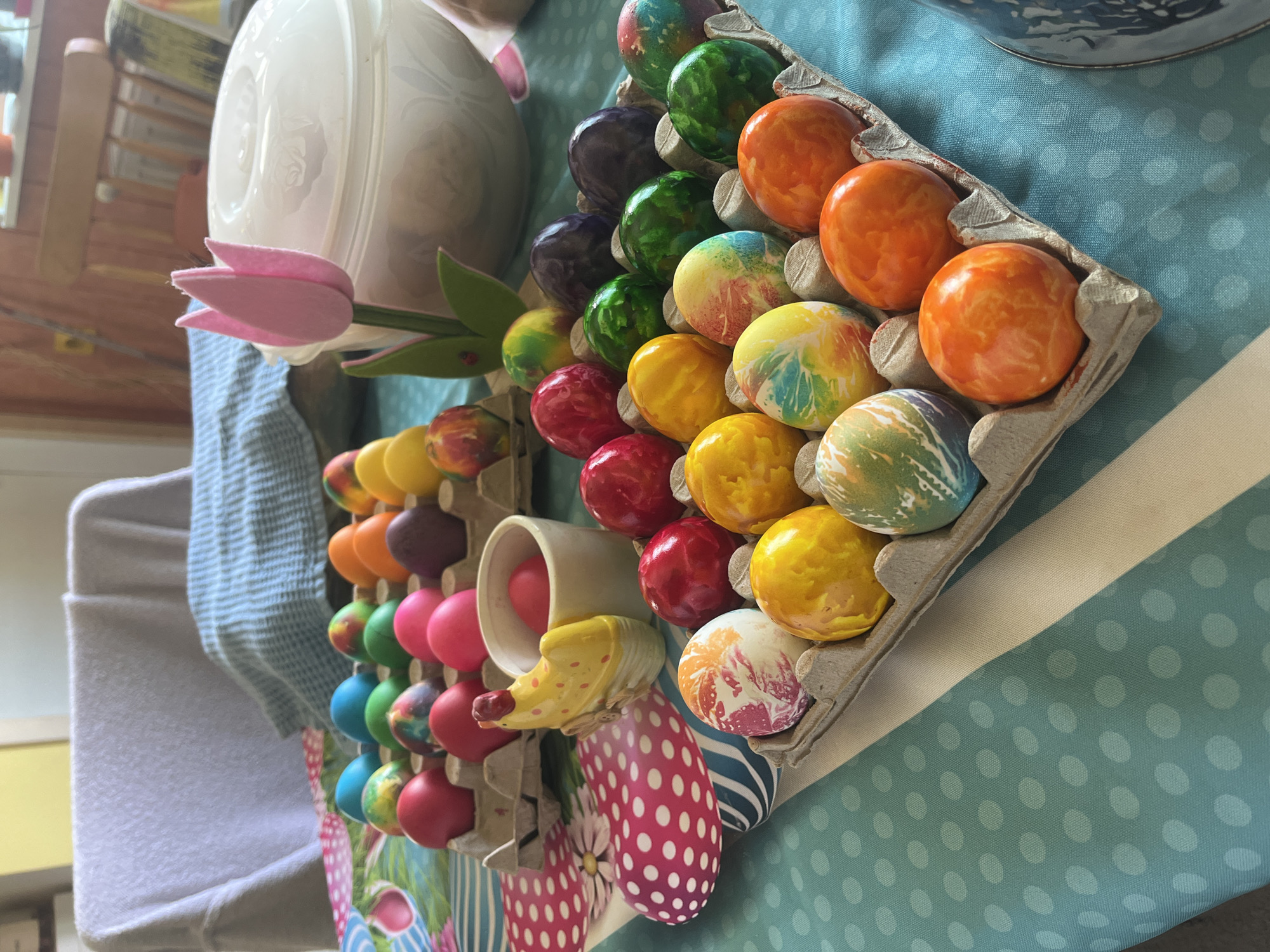 - "The image depicts a collection of Easter eggs arranged in two cardboard egg cartons on a blue and white polka-dot tablecloth" by FM-8osjd2, licensed under CC BY 4.0