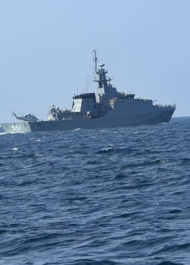 A gray military ship with the number 551 printed on its side is moving through a choppy blue sea under a clear, light blue sky