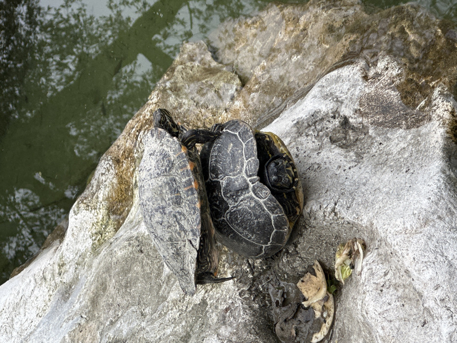 - "Two freshwater turtles are stacked on a light-colored, textured rock formation situated at the edge of a murky green body of water" by FM-5c2ij2, licensed under CC BY 4.0