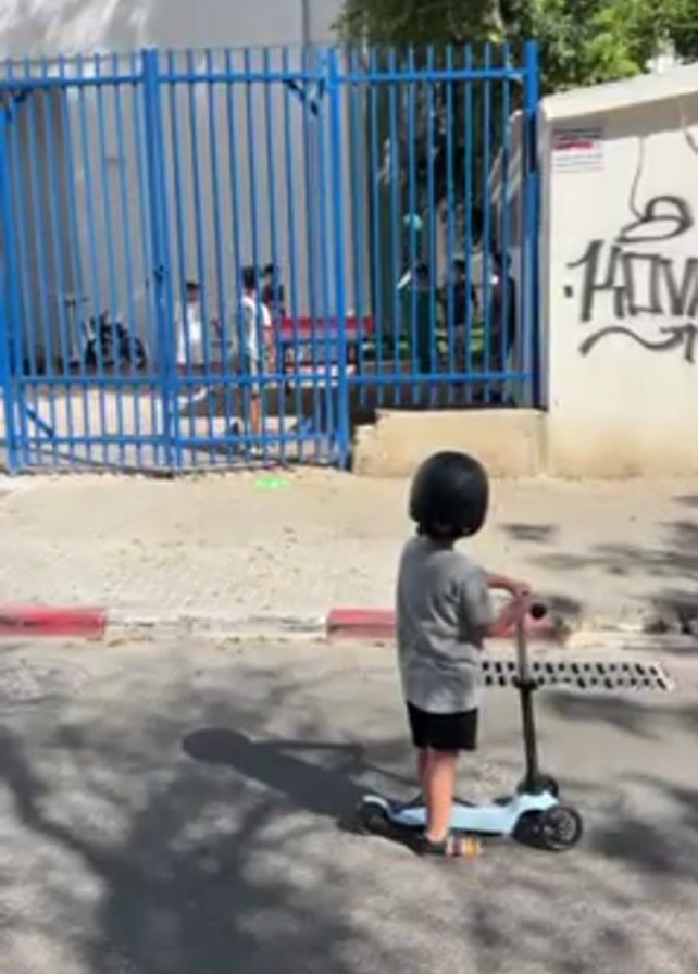 A young child wearing a black helmet, a grey t-shirt, and black shorts is standing on a light-blue scooter on a paved surface. The child is facing away from the camera, towards a blue metal gate. Behind the gate, there are several children. To the right of the gate is a white wall with black graffiti on it. There is a tree visible behind the wall. The sun is shining, casting a shadow of the child and the scooter on the ground. There is a red curb separating the paved surface from the area behind the gate. In the background, some bicycles are visible through the gate.
