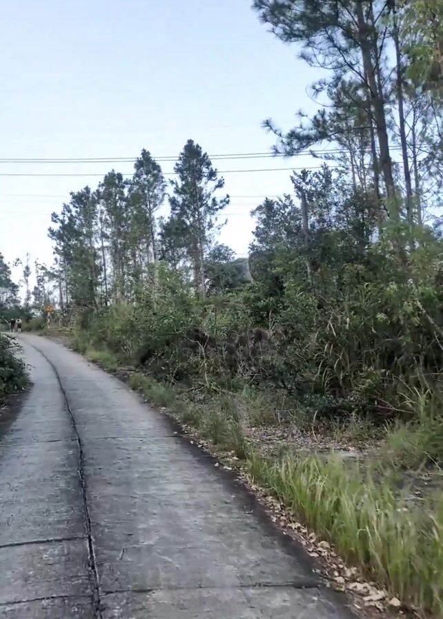 narrow, cracked concrete road leading uphill. Tall trees line both sides of the road, with dense green foliage filling the spaces between the trees. Overhead, power lines stretch across the sky. In the distance, near the top of the hill, two people are walking. The sky is a pale blue. The overall scene is rural and somewhat overgrown.