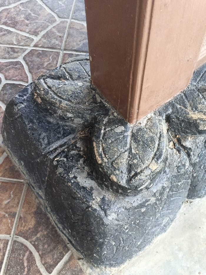 The scene depicts the lower portion of a square, reddish-brown painted post rooted in a dark grey, decorative stone or concrete base