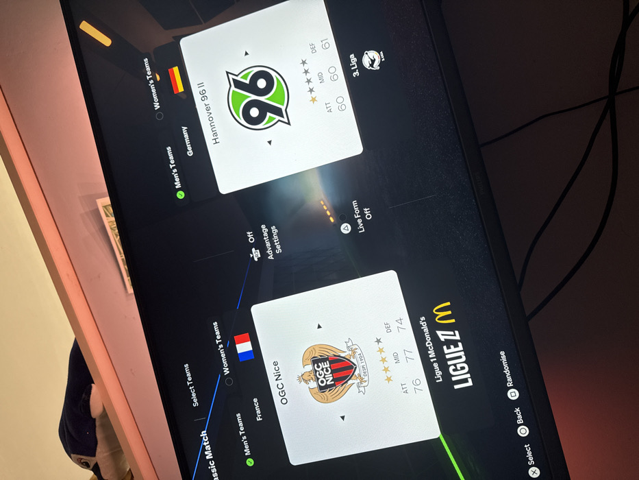 - "An upward-angled photograph depicts a television screen displaying a video game interface for team selection, likely within a football simulation game" by FM-fWiKA2, licensed under CC BY 4.0