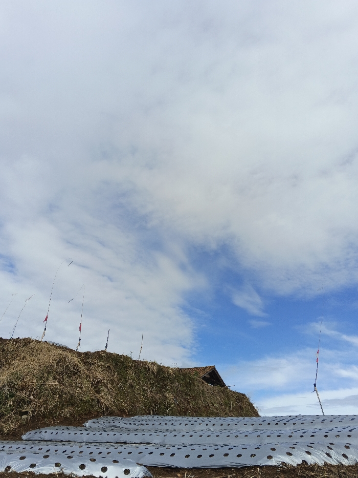 A field covered with rows of white plastic sheeting punctuated by holes stretches towards a grassy knoll. The hillside is dotted with tall, thin poles bearing small flags. A roof partially visible behind the hill suggests a dwelling. Above, the sky transitions from a dense expanse of white clouds to patches of clear blue. The scene evokes a sense of rural cultivation under a dynamic sky.