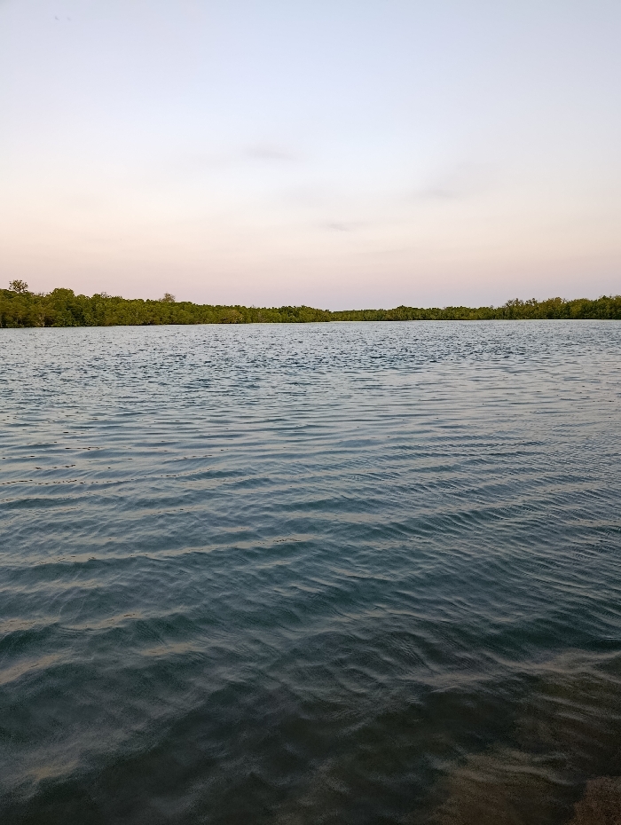 The image displays a serene estuarine or coastal environment in Vanga, Kenya, under the ambient light of either dawn or dusk. The majority of the frame is occupied by a body of water, characterized by subtle, horizontal ripples that create variations in light and shadow across its surface. The water exhibits a gradient of color, transitioning from a lighter blue-gray in the mid-distance to a darker, almost opaque, tone in the immediate foreground. A small, indistinct patch of sandy or muddy shoreline is visible in the lower right corner. Directly across the horizon, a dense, continuous band of vibrant green foliage, indicative of a mangrove forest, extends horizontally, separating the water from the sky. The sky above is clear, presenting a soft color gradient from a pale, light blue at the top to a faint pinkish-orange hue just above the distant treeline. No human figures, vessels, or artificial structures are present, depicting an untouched natural landscape.