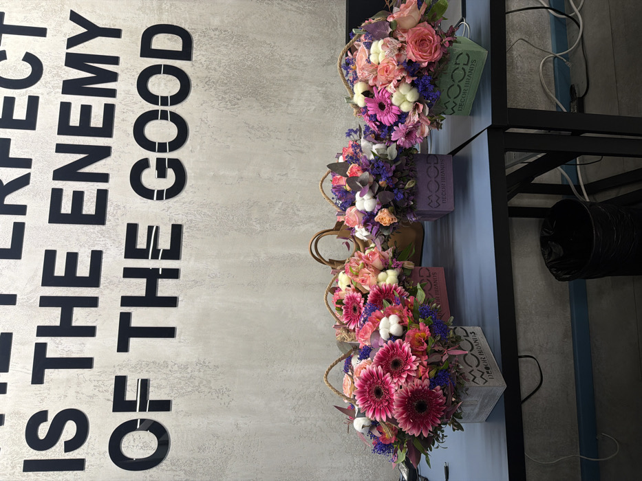 The image captures an indoor commercial environment, identified by "WOOD DECOR BRANDS" branding, likely located in Yerevan, Armenia. Four floral arrangements are displayed prominently on a dark blue rectangular table. Each arrangement is contained within a rectangular wooden box featuring a rope handle and the "WOOD DECOR BRANDS" logo. From left to right, the boxes are light gray, pink, lavender, and mint green. Each arrangement consists of a mix of fresh cut flowers including pink gerbera daisies, pink and peach roses, purple filler flowers, and white cotton bolls. Behind the second arrangement from the left, a light brown woven basket or bag is visible. A black trash can with a plastic liner is positioned beneath the left side of the table. White electrical cables are visible on the floor and beneath the right side of the table. The background wall is textured light gray, with large, black, three-dimensional letters affixed to it. These letters partially spell out "PERFECT IS THE ENEMY OF THE GOOD". No individuals are present in the scene.