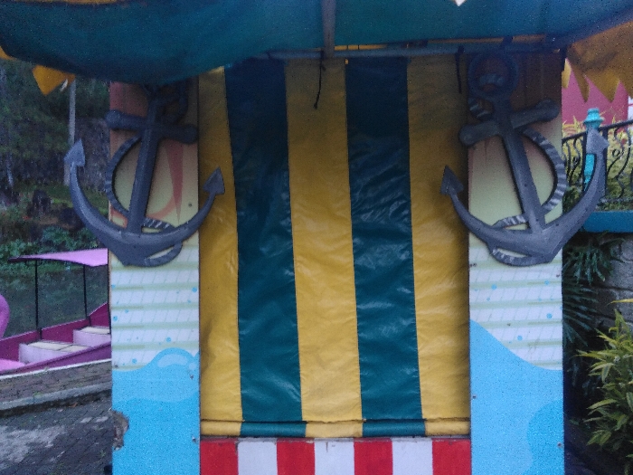 The scene depicts a nautical-themed concession or service booth situated in a recreational area within Casa de Paja, Venezuela. The booth's facade consists of a large fabric panel with alternating vertical stripes of dark teal and yellow, serving as a closed shutter or backdrop. Two large, dark gray anchor cutouts, each with an attached rope design, are mounted prominently on light-colored vertical panels flanking the striped fabric. These panels also feature a light blue wave pattern at their base, above a red and white horizontally striped lower section of the booth. A dark teal or green awning extends over the top of the structure. To the left of the booth, a pink and white paddle boat with an open canopy is visible, partially obscured by the booth's structure. Beyond the boat, a dark, possibly paved or wet, surface is present, leading to a background dominated by dense green foliage or a hillside under diffused lighting. To the right of the booth, a section of decorative dark metal fencing with light blue accents is visible, behind which additional green plants grow. Further in the background on the right, a structure with a reddish roof and yellow, wavy trim is partially discernible. No individuals are present in the image, and no specific actions or interactions are depicted.