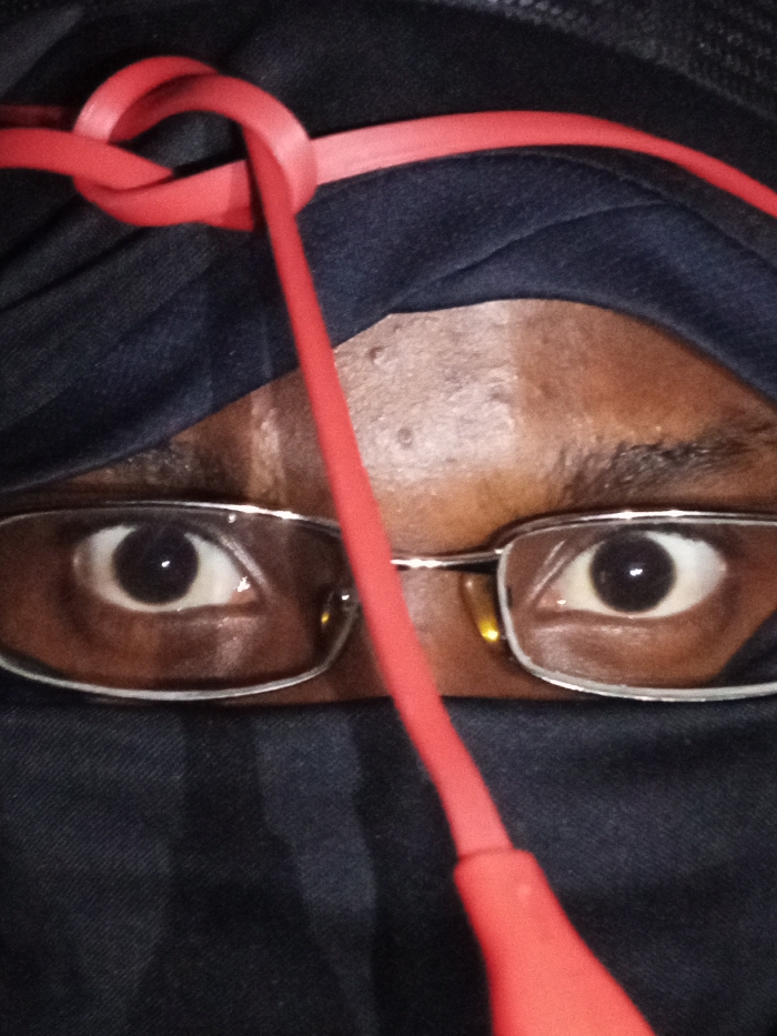 A close-up shot shows a person's eyes framed by silver-rimmed glasses. Part of their face is obscured by a dark blue or black fabric hood or mask. A bright red cord, possibly earphones, is knotted above the forehead and drapes down the face. The person's skin is brown. The image's focus is sharp on the eyes and glasses, creating a sense of mystery or concealment.